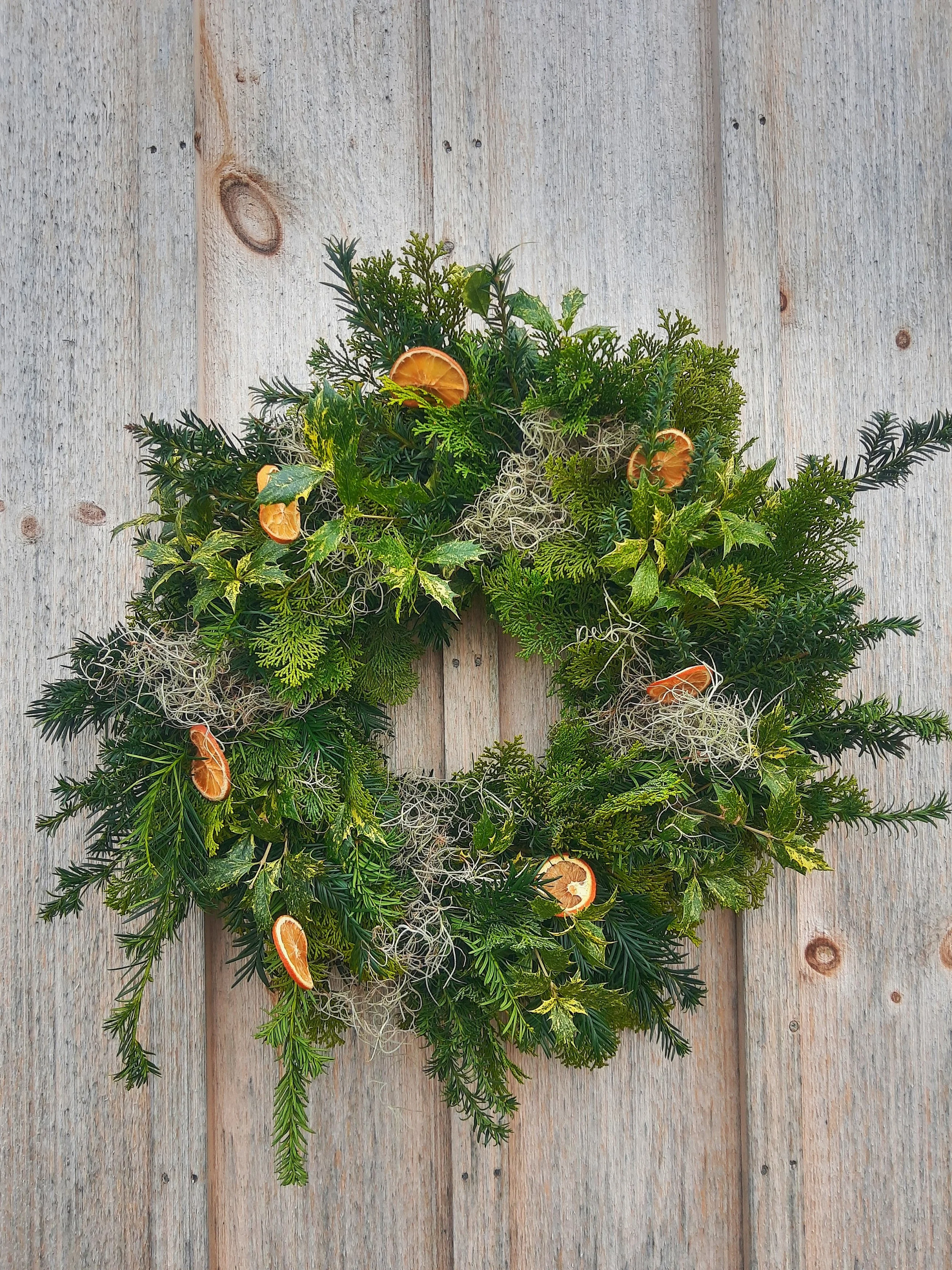 As a nod to my husband's roots growing up in Florida, I have created this mixed evergreen wreath with dried orange and Spanish Moss accents. Pre-order only. Allow 48 hours after email confirmation for pick up. Local delivery within 20 miles is available for a fee.